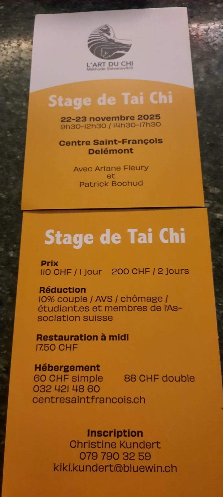 Le week-end du 22 et 23 novembre 2025 | 09h30 - 12h30 / 14h30 - 17h30 | Week-end 108 postures au Jura animé par Ariane Fleury et Patrick Bochud | Centre Saint-François, Delémont Inscription : Christine Kundert, 079 790 32 59, kiki.kundert@bluewin.ch |