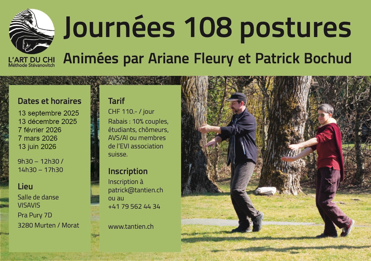 Les samedis 13.09.2025, 13.12.2026, 07.02.2026, 07.03.2026 et 13.05.2026 | 09h30 - 12h30 / 14h30 - 17h30 | Journées 108 postures 25-26 animées par Ariane Fleury et Patrick Bochud | Ecole de danse VISAVIS, Pra Pury 7D, 3280 Murten / Morat Inscription via Email ou 079 562 44 34 |